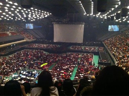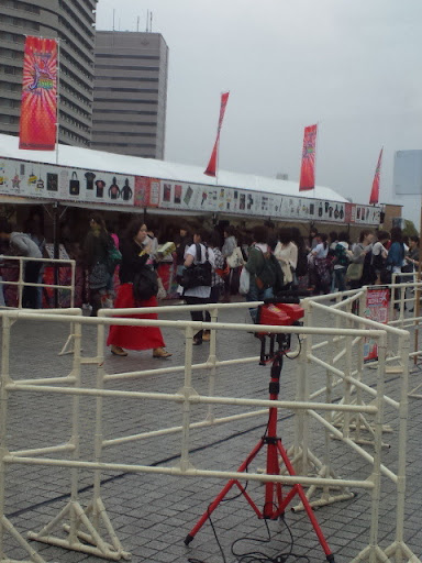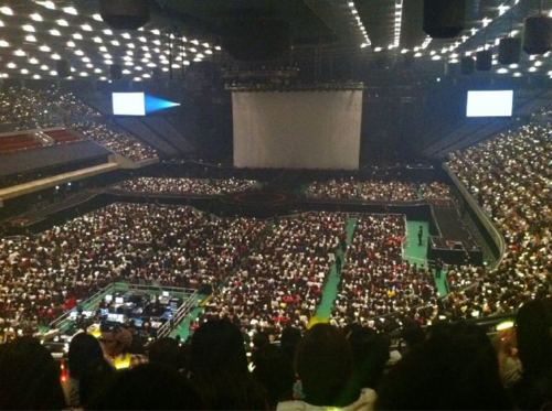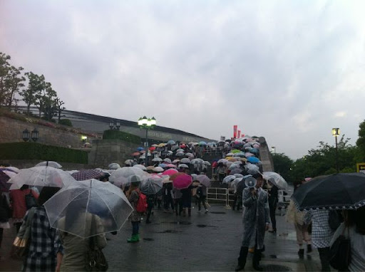 Last night, the Japanese blogs posted pictures of the empty spaces people saw on the left side of the arena and a lot of people were worried that tickets weren’t selling well. I asked today and found out the spaces were reserved for disabled people, and it was not for sale for the public. Tickets for the concert were on sale in 3 places and they were sold out within a few minutes of its release. Even though it rained heavily today, but a lot of people without tickets still lined up hoping to buy some and there were a lot of people buying official goods. Keke don’t worry! ^^